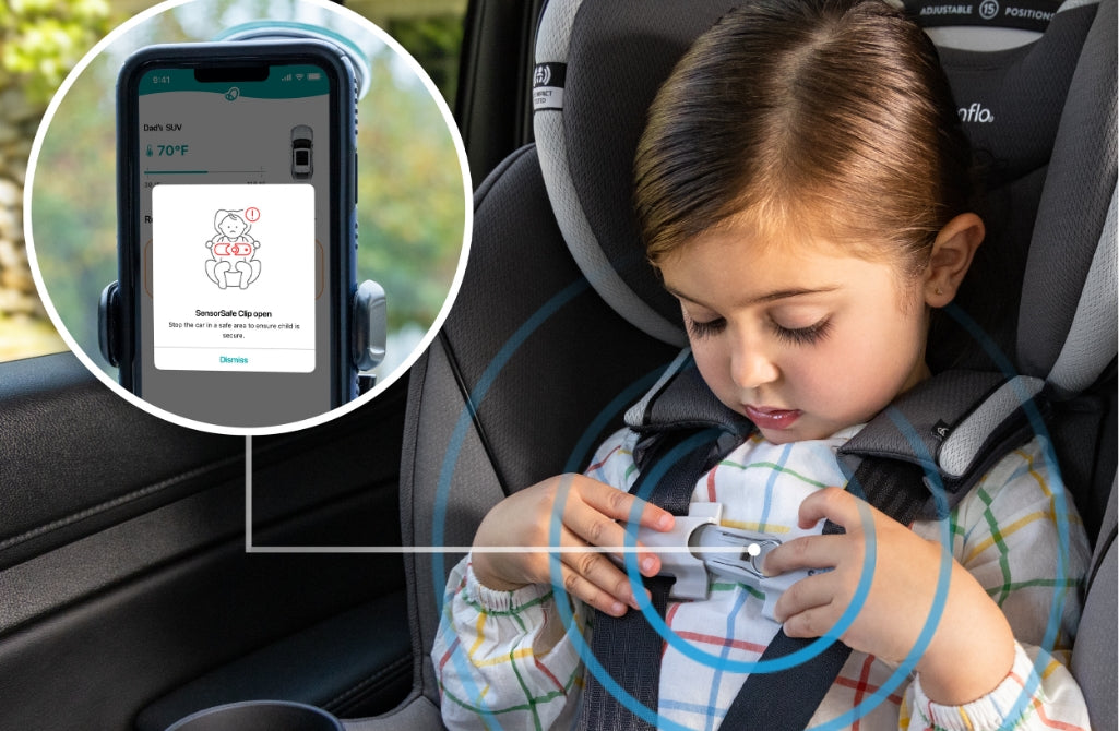 Once connected via the Evenflo App, car seats with the SensorSafe® chest clip provide real-time alerts about four potentially unsafe conditions from the back seat.