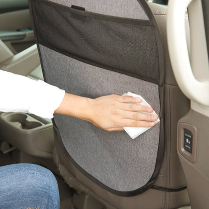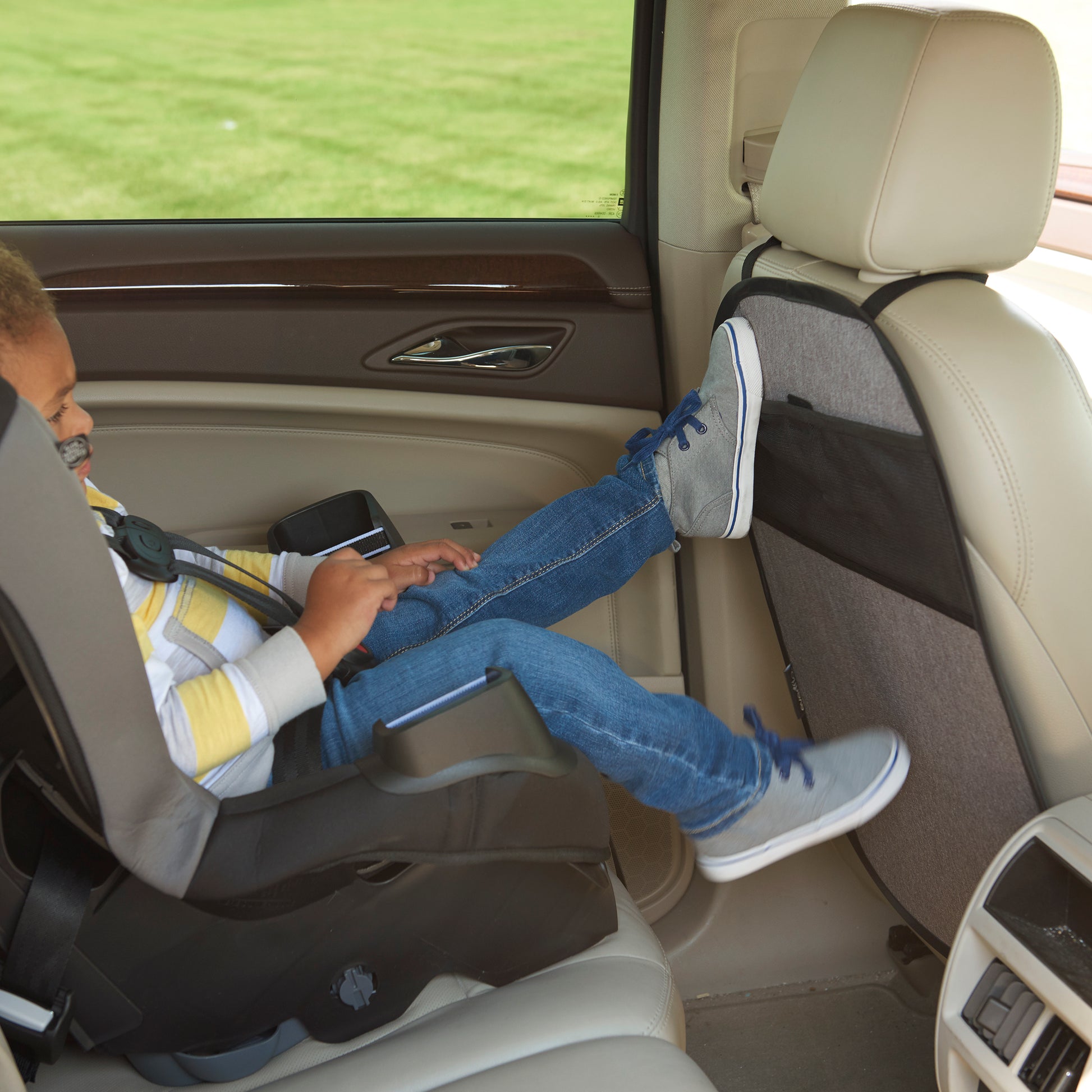 Extend the life of your vehicle’s interior with an Evenflo® Car Seat Kick Mat. Designed to give the back of your vehicle seats protection from stains, scuffs and everyday wear and tear. Ideal for vehicles with child and pet passengers. Easy installation with an adjustable top strap with buckle that wraps around the headrest and bottom elastic band that keeps the kick mat flush with the seat back. Universal design fits most vehicles. The extra mesh pocket with Velcro® closure holds essentials and helps keep your vehicle organized. Premium materials are easy to wipe clean, ensure durability and eliminate stretching or shrinking, and the waterproof backing protects the vehicle seat upholstery from spills and stains.