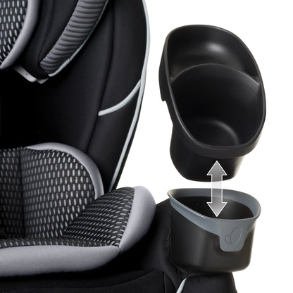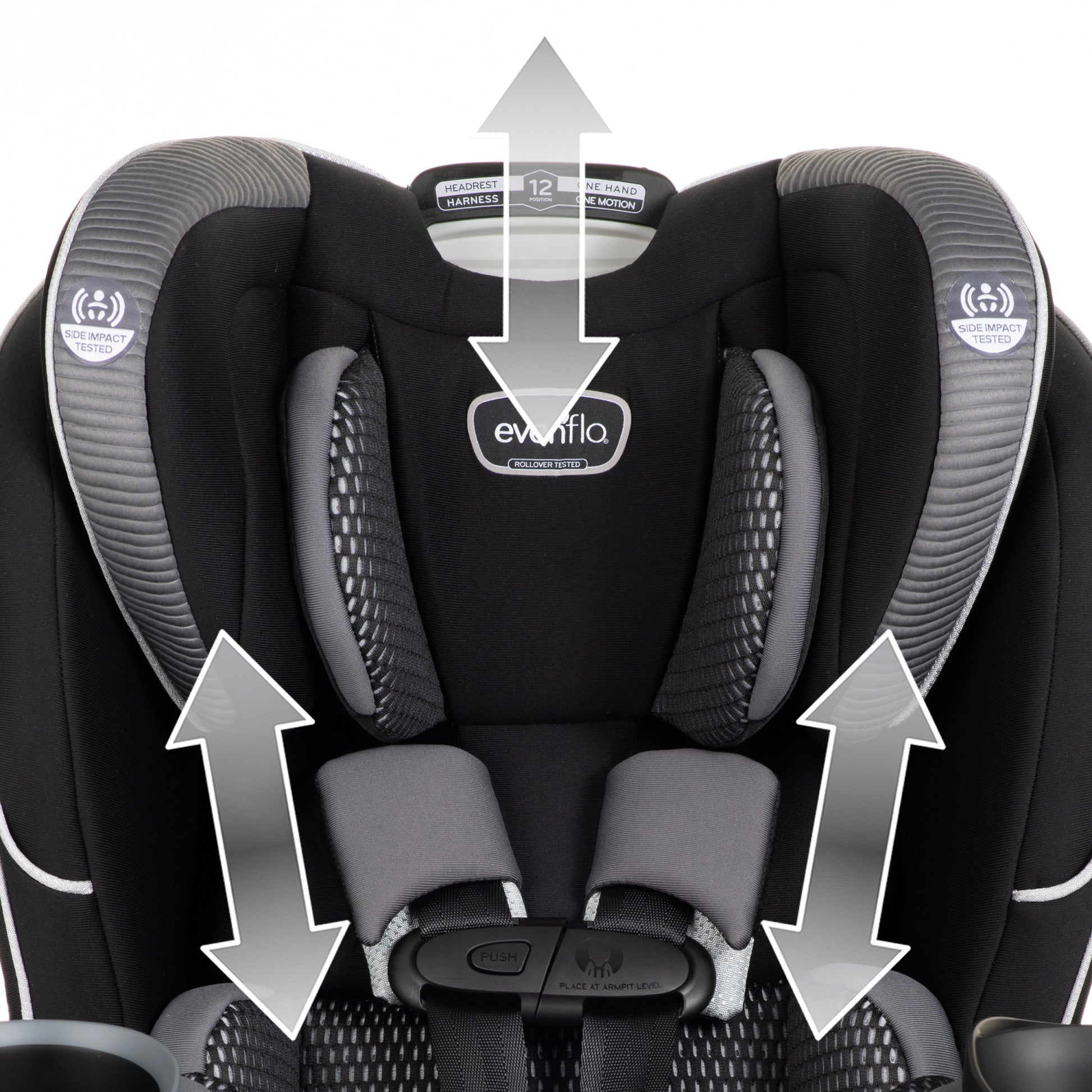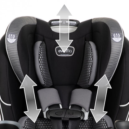 The Evenflo EveryFit/All4One 3-in-1 Convertible Car Seat has been engineered for maximum comfort, safety, and longevity. This car seat accommodates your child by adjusting to multiple positions, allowing kids to ride rear-facing beyond 2 years of age —without extending the seat or cramping other passengers. This all-in-one car seat provides a safe and secure ride for up to a decade. It can be used as a rear-facing car seat with harness, forward-facing car seat with harness and belt-positioning high-back booster that helps keep children 4 - 100 lb secure while riding in a vehicle. The one-hand, 12-position headrest and no-rethread harness enable a proper fit during each ride and as child grows – without uninstalling the car seat. For additional convenience, this all-in-one car seat is designed with removable cushions, machine-washable fabrics, two integrated cup holders and removable snack tray.Child Fit - Rear Facing