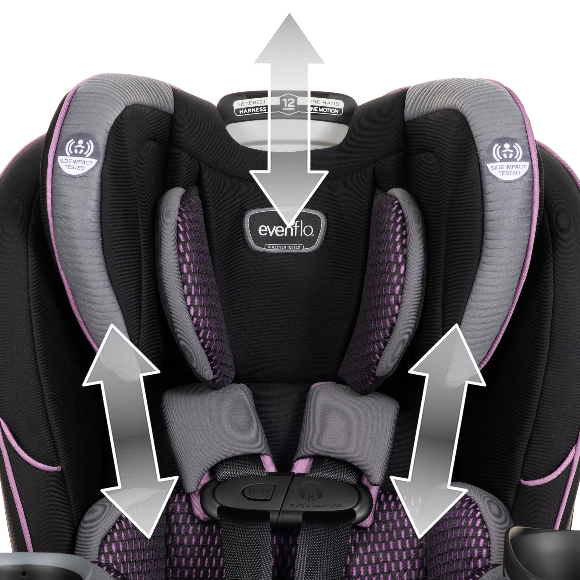 The Evenflo EveryFit/All4One 3-in-1 Convertible Car Seat has been engineered for maximum comfort, safety, and longevity. This car seat accommodates your child by adjusting to multiple positions, allowing kids to ride rear-facing beyond 2 years of age —without extending the seat or cramping other passengers. This all-in-one car seat provides a safe and secure ride for up to a decade. It can be used as a rear-facing car seat with harness, forward-facing car seat with harness and belt-positioning high-back booster that helps keep children 4 - 100 lb secure while riding in a vehicle. The one-hand, 12-position headrest and no-rethread harness enable a proper fit during each ride and as child grows – without uninstalling the car seat. For additional convenience, this all-in-one car seat is designed with removable cushions, machine-washable fabrics, two integrated cup holders and removable snack tray.Child Fit - Rear Facing