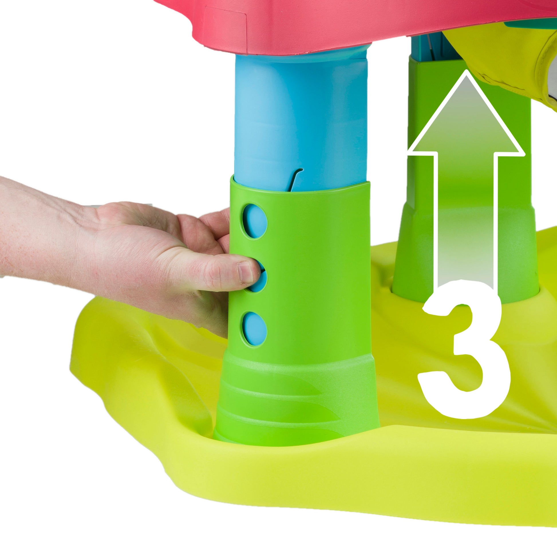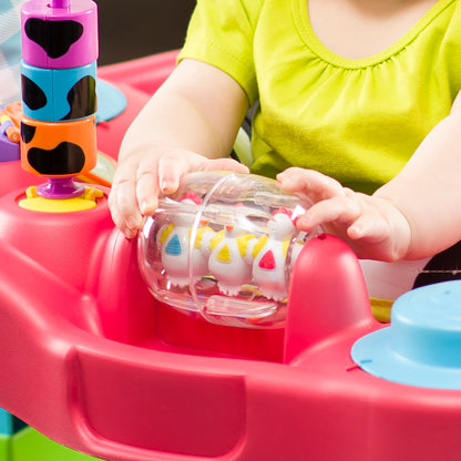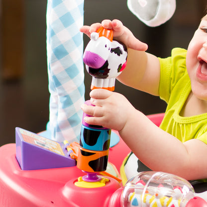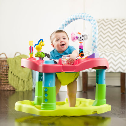 The ExerSaucer® Moovin’ & Groovin’ Bouncing Activity Saucer will have your little one entertained ‘til the cows come home! Give them hours of developmental fun with 360 degree seat spin, a unique rocking base, 12+ activities and a variety of colors and patterns. A stable full of farm animals including horses, cows and pigs are waiting to play with your baby. Bouncing, reaching, turning and stretching are all part of your child’s development. You’ll also love that the seat cushion is machine-washable, toys are easy to clean, and set-up is quick and easy, without any tools required. With three height settings, the Moovin’ & Groovin’ saucer will be a favorite as they grow.