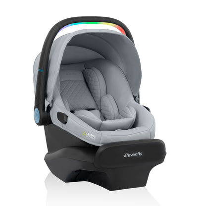 Introducing the Evenflo® LiteMax™ NXT Infant Car Seat with SensorySoothe™ technology. You’ve never seen anything like this! SensorySoothe technology engages and calms your baby with lights, music and sounds integrated into the infant car seat handle. Cue a mesmerizing light show with music via the Evenflo app on your mobile device! Integrated SensorSafe® technology adds a layer of protection, alerting you in real-time via Bluetooth® to 4 potentially unsafe conditions from your child’s car seat: unexpected chest clip unbuckling, unsafe ambient temperature, child unattended, and child buckled too long. LockStrong™ belt tensioning system provides solid, secure installation in no time. LiteMax NXT’s plush, environmentally friendly Green & Gentle™ Fabric is woven from recycled plastic bottles, free of added chemicals and added flame retardants — a choice you can feel good about. LiteMax NXT accommodates infants 3 to 30 lb (15.7 in. to 32 in. tall).