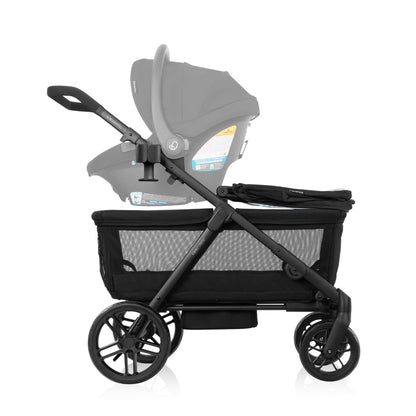 Compatible with LiteMax™, LiteMax NXT, and Shyft™ DualRide™ Infant Car Seats (sold separately) for use from infant to toddler. Features include 3-panel UPF 50+ canopy, 2 removable snack trays, storage pocket, a parent cupholder, and all-terrain wheels. Folds flat for compact storage. GREENGUARD Gold Certified.