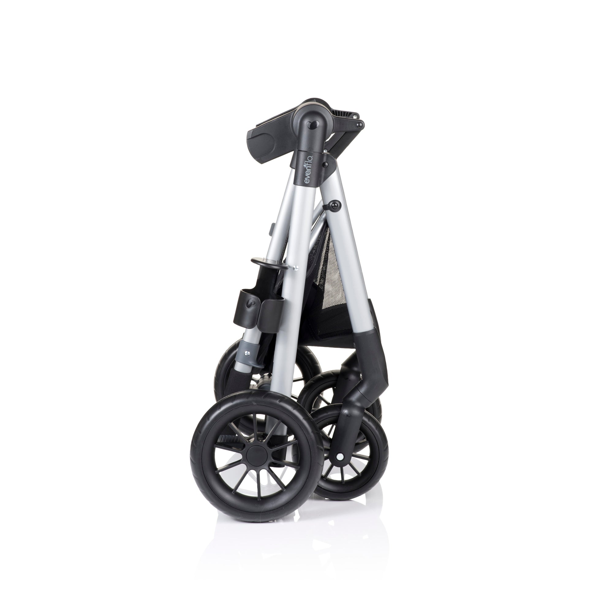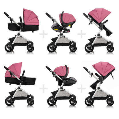 Offers a multi-position modular frame with 6 modes of use! The stroller converts easily from an infant car seat frame stroller to stroller seat and carriage mode. Each mode, baby can face in or out and is easily adjusted. The carriage mode is perfect for infants and offers a cover for chillier days. The new Cruiser Tires have a sleek look and the over-sized rear wheels provide an easier ride.