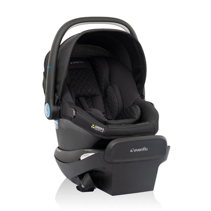 The Evenflo® Revolve180TM LiteMaxTM NXT Rotational Infant Car Seat with SensorySootheTM technology has it all. For infants weighing 3-30 lb (15.7-32 in.), this car seat offers one-hand, 180° rotation for easy in and out. SensorySoothe technology engages and calms your baby with lights, music and sounds integrated into the infant car seat handle. Cue a mesmerizing light show via the Evenflo app on your phone! SensorSafe® technology adds a layer of protection for peace of mind, alerting you to 4 potentially unsafe conditions from your child’s car seat. LockStrongTM belt tensioning system provides solid, secure installation in no time, while SecureTightTM technology helps you achieve a tighter installation with up to 50% less effort. Soft, sustainable Green & Gentle™ Fabric is woven from recycled plastic bottles, free of added chemicals and flame retardants — one more thing you can feel good about. Compatible with adjustable SafeZone™ Load Leg accessory, adjustable support leg with easy-to-read indicators which helps stabilize the seat base by limiting rotation and reducing crash forces (sold separately).