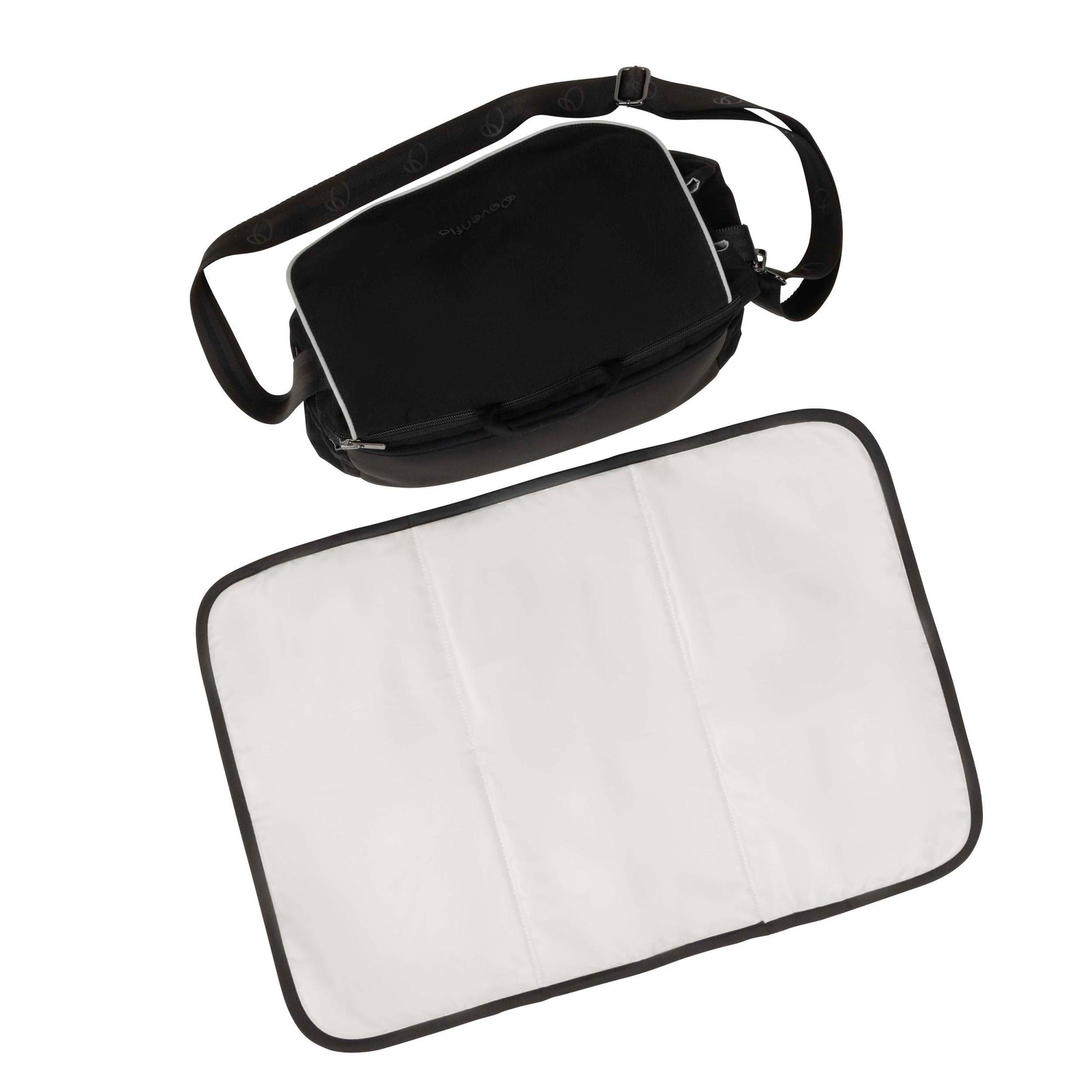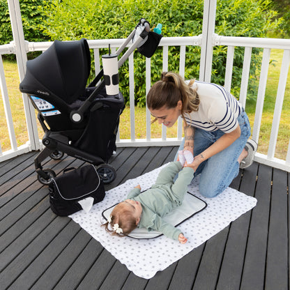 On the run to the store or pediatrician with your little one and need to bring essentials? Take it to go in our stylish Babe on the Run Bag for even more convenience from your Evenflo® Shyft™ DualRideTM Infant Car Seat and Stroller Combo! Crafted of a durable polyester weave, this lightweight, 10 in. h x 13 in. w x 6 in. d infant essentials bag with included diaper changing pad coordinates with your DualRide. It easily attaches within hand’s reach on the back of your stroller. But that’s not all — this dual-use bag converts to a sophisticated crossbody messenger for hands-free wear using the included crossbody strap with logo. Lobster claw clips ensure easy strap removal and the polyester strap tucks neatly into a dedicated storage pocket on the side of the bag. The Babe on the Run is designed with a gusseted bottom so your bag will stand on its own — such a help when loading. Lined in light grey to help you find what you need quickly, the spacious interior opens wide and offers plenty of room for a change of clothes and diapers. Storage options abound inside and out to help you stay organized. Inside, you’ll find a padded cupholder for a sippy cup or bottle up to 5 in. tall, 3 mesh pockets (for small items), a slide-in pocket for a tablet or phone, and a handy key ring loop. Also inside is this brilliant design cue: a zippered, vinyl-lined interior pocket holds wipes neatly — and a hidden dispenser opening on the front exterior of the bag allows you to instantly grab them with one hand as needed without even opening your bag! Outside storage includes a zippered pocket that holds the included 15 in. x 21 in. padded changing pad, as well as 2 gusseted side pockets for water bottles. Premium chrome zippers and pulls add finesse to the minimal, modern profile. A drawstring closure ensures items stay secure in the main interior while the magnetic-close front flap adds a stylish layer of containment. Traveling? A handy neoprene pass-through pocket allows you to slide the bag over a rolling luggage handle to lighten your load while navigating airports or hotels. Designed to stand up to daily use, your Babe on the Run Bag can be spot-cleaned as needed.