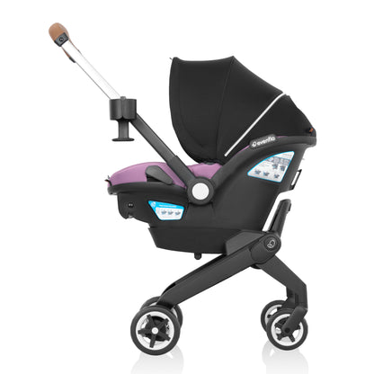 It’s a car seat & stroller & carrier & head-turner in one! The Evenflo® Shyft™ DualRide™ Infant Car Seat Stroller Combo with Carryall Storage & Extended Canopy is a single piece of baby gear that Shyfts from infant car seat to stroller in one step. Moving from car to sidewalk? Lift carrier off the base, release the wheels and roll on. Maneuvering stairs? Retract the wheels, carry up or down steps, pop the wheels back down and go. No struggling with multiple pieces of gear. No disturbing your little one. With real-time SensorSafe® alerts via Bluetooth® connection, this remarkable stroller car seat combo makes every trip easier. Designed for infants 3 lb to 30 lb, and 15.7 in. to 32 in.Features
