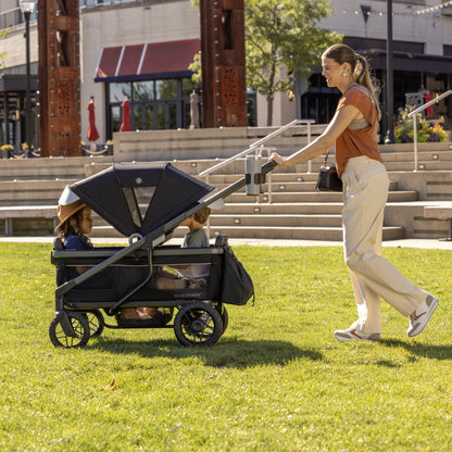 ESCAPE THE EVERYDAY: Rugged-meets-refined stroller wagon engineered for performance features all-terrain, no-flat urethane wheels and rear suspension to take you off the beaten path; accommodates up to two children ages 6 months to 5 years
