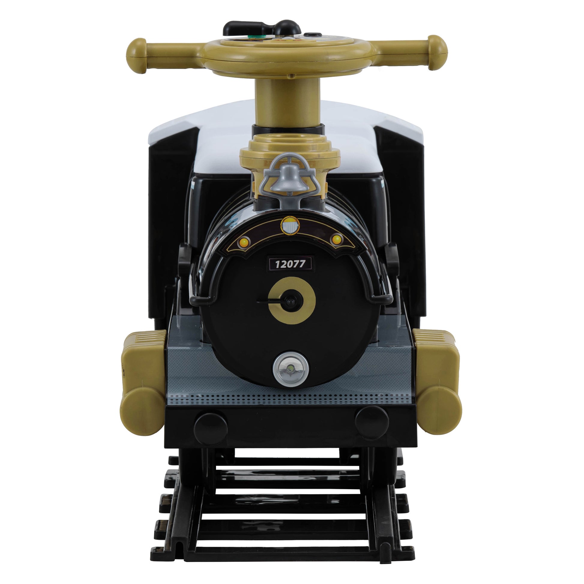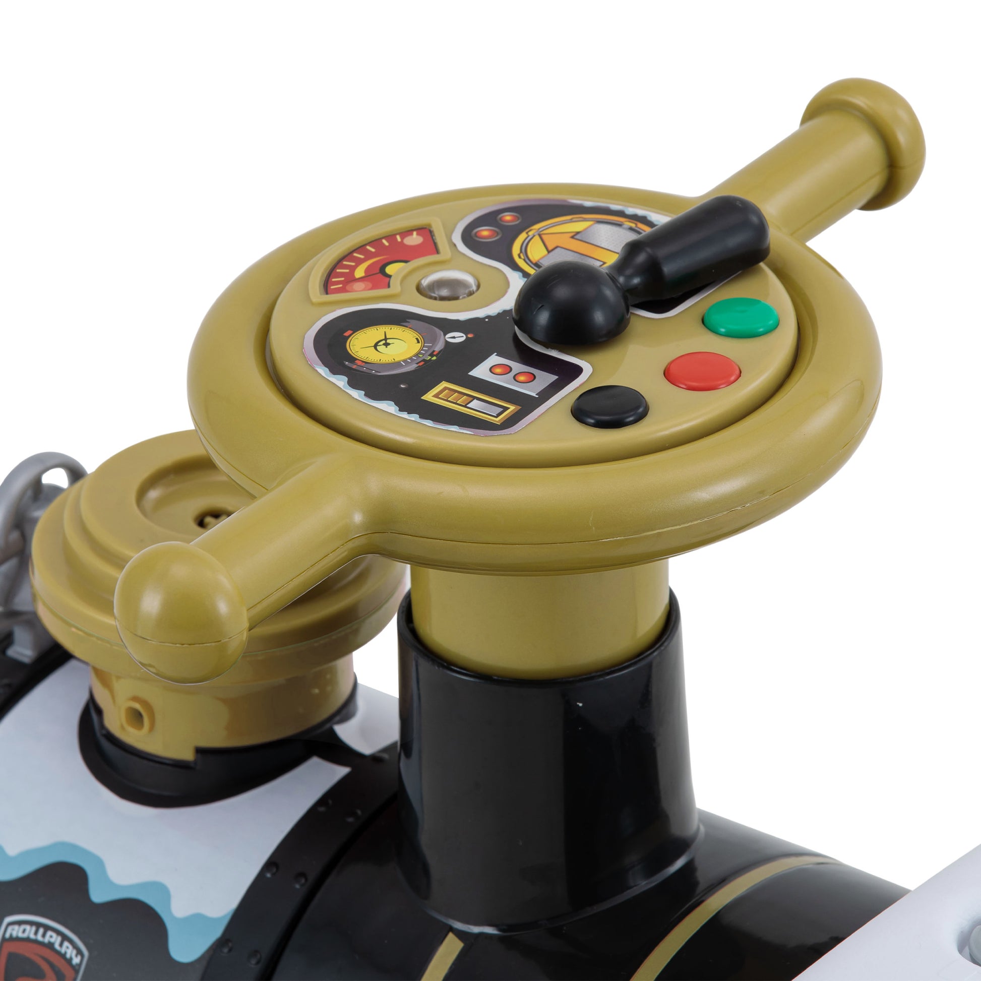 Turn your playroom into a train station with the Rollplay® 6V Steam Train! Toddlers who love trains will have hours of fun playing engineer with this battery-powered, ride-on train set. The train releases authentic cold water steam as it chugs around the 24-foot oval track. Designed to look like the freight trains of the Old West, this durable toy is a great choice for little cowboys, cowgirls, and all pint-sized railroad enthusiasts! This train features realistic sounds — the push-button activates a train whistle or a chuffing noise. Almost like the real thing, this train releases steam in the form of cold water vapor. The fully detachable caboose allows your child to bring favorite toys along for the ride. With forward and reverse capability at a maximum speed of just 1 mph, this train is the perfect ride-on for new conductors! The 22-piece track can be assembled as a 24 ft. oval or a 13 ft. circle. For children age 2 years and older, weighing up to 45 lb. Backed by a limited 1-year warranty on the vehicle, a limited 6-month warranty on the battery, and the support of a dedicated U.S. Customer Service team.