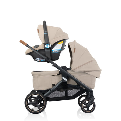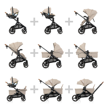 One product. Every mode. Every stage. The Evenflo® Transformer™ Stroller to Wagon Travel System, featuring the LiteMax™ NXT Infant Car Seat with SensorSafe® and SensorySoothe™ technology, transforms from stroller to wagon with no extra parts. With 9 modes of use and a 130 lb capacity, it’s the first stroller-to-wagon travel system that grows from 1 kid to 2. SensorySoothe™ technology uses lights, sounds and music to calm your baby. Plush, sustainable Green & Gentle™ Fabric in Travertine fashion is woven from recycled bottles, free of added chemicals and flame retardants. From first rides to big-kid adventures, this all-in-one system evolves with your family.Features